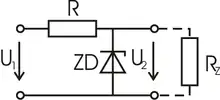 بواسطة صمام ثنائي زينر مستقطب في المنحى المعاكس ومقاومة كهربائية، يركبان على التوالي، ويوضع الحمل بالتوازي مع زينر، (أنظر الصورة جانبه). يتميز الصمام الثنائي زينر بجهد زينر وبالقدرة القصوية التي يستطيع تحملها، وتحتسب قيمة المقاومة حسب قيمة التوتر بين طرفيها والتيار القصوي المطلوب وذلك بتطبيق قانون أوم.[1]