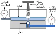 في رسم الصمام أحادي المرحلة الموضح جانبا، يستخدم الغشاء مع صمام قفاز للتحكم بالضغط. فكلما زاد الضغط في الحجرة العلوية دفع الغشاء للأعلى مما يقلل من سريان المائع نتيجة لحركة الصمام، وبالتالي يقل الضغط الخارج من الصمام. وبالتحكم بالمسمار العلوي يمكن التحكم بالضغط الخارج من الصمام.