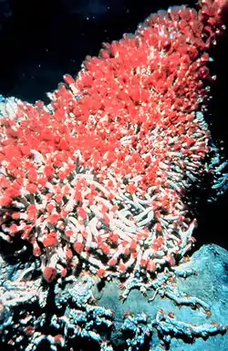 تكون الديدان الأنبوبية - التي يصل طولها إلى مترين - جزءا كبيرا من مستعمرات الأحياء حول الفوهات المائية الحرارية . وليس لها فم أو أعضاء هضم ولكنها تمتص الغذاء الذي تكونه بكتيريا تعيش في داخلها . تحتوي الديدان الأنبوبية على حبيبات حمراء تحتوي على هيموجلوبين . ويتحد الهيموجلوبين مع سلفيد الهيدروجين وينقله إلى البكتريا التي تعيش في أحشاء الديدان الأنبوبية .وتغذي البكتيريا وتمده بمركبات الكربون . وقد اكتشفت مستعمرة حيوية تسمى إيل ستي أو " مدينة ثعبان السمك" يغلب فيها تواجد ثعابين السمك . وتقع "مدينة ثعابين السمك" بالقرب من فوهة بركان نافونوا، سموا الأمريكية.[12]