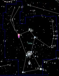 |CitationClass=تم تجاهله (مساعدة) - Stella lucida in umero dextro, quae ad rubedinem vergit. "Bright star in right shoulder, which inclines to ruddiness."