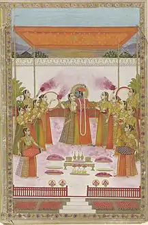 Object history note: The arch is covered with figures of Vaishnavite gods and hung with rings. A crowd of Hindus are celebrating the festival of the Dol Jatra or Swing festival in which the image of Vishnu and his consort are swung in a throne suspended by chains from the rings of the arch. The celebration is part of the Holi festival and takes place at the full moon of the month of Phalguna (February to March).