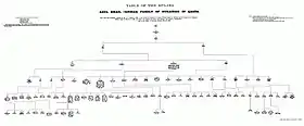 ![]() شجرة نسب أسرة آل مهنا أبا الخيل الحاكمة في بريدة من كتاب دليل الخليج للمؤرخ البريطاني لوريمر عام 1905 | |||||||