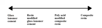 في أواخر الخط أو الطيف باتجاه الملاط الزجاجي الشاردي، هناك زيادة في إفراز الفلورايد وزيادة في المحتوى الحمضي القاعدي. أما نهاية الراتنج المركب من الطيف، هناك زيادة في نسبة العلاج الضوئي المستعمل وزيادة في قوة المقاومة والمرونة.