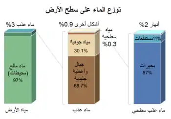 إن أغلب الماء الموجود على الأرض هو ماء مالح (97%)، في حين أن 3% فقط من الموارد المائية تكون مياه عذبة، وأكثر من ثلثي موارد المياه العذبة موجود على شكل متجمد في المثالج والأغطية الجليدية القطبية.[1] أما باقي موارد المياه العذبة غير المتجمدة فتوجد في المياه الجوفية، والباقي على شكل بحيرات وأنهار وجداول على سطح الأرض أو على شكل بخار ماء.[2]