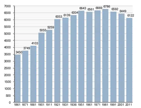في سنة 1861 بلغ عدد السكان 3٬450 نسمة، وتطور العدد ليصل في سنة 2011 لـ 6٬122 نسمة.
