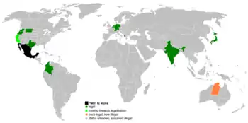 بعض الحكومات في جميع أنحاء العالم لديها تشريع يسمح بالقتل الرحيم الطوعي ولكن بصفة عامة في العالم لا تزال جريمة قتل جنائية. في هولندا وبلجيكا، حيث تم تشريع القتل الرحيم، فإنها لا تزال تعتبر قتلا على الرغم من أن مرتكبها (الطبيب) لا تتم ملاحقته قضائيا ولا يعاقب طالما أنه استوفى بعض الاستثناءات القانونية المعينة.[32][33][34][35]