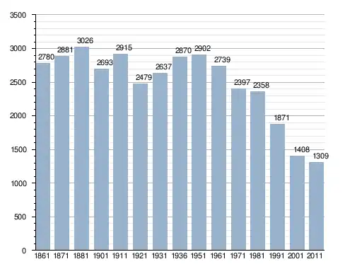 في سنة 1861 بلغ عدد السكان 2٬780 نسمة، وتطور العدد ليصل في سنة 2011 لـ 1٬309 نسمة.