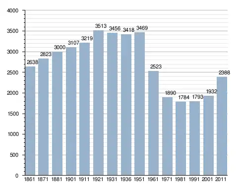 في سنة 1861 بلغ عدد السكان 2٬638 نسمة، وتطور العدد ليصل في سنة 2011 لـ 2٬388 نسمة.