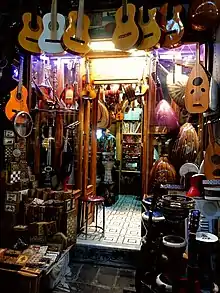 - جيتار/ قيثارة (Guitar): آلة موسيقية من الآلات الوترية، ويوجد الجيتار الكلاسيكي والجيتار الكهربائي. ويُصنع جسم الجيتار من الخشب، أما الأوتار فمن النايلون أو المعدن والتي تُشد على ستة مفاتيح موجودة على نهاية ذراع طويل ملحق بجسم الجيتار الخشبي.
