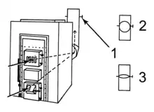 المثبط في المداخن موقد مدخنة (1) يتحكم العرض الجوي التي يجري وضعها مفتوحة (2) أو مغلقة(3).