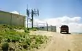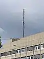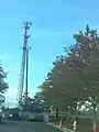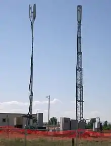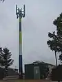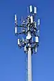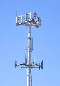 ![]() برج خلوي يحمل هوائيات لأربع شبكات خلوية (مفصولة رأسياً على القطب الداعم) (التركيب الخلوي (AWS)) | |