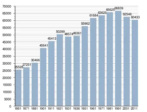 في سنة 1861 بلغ عدد السكان 25٬528 نسمة، وتطور العدد ليصل في سنة 2011 لـ 60٬433 نسمة.