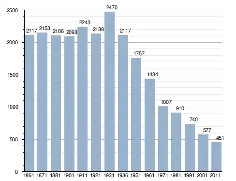 في سنة 1861 بلغ عدد السكان 2٬117 نسمة، وتطور العدد ليصل في سنة 2011 لـ 451 نسمة.