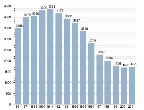 في سنة 1861 بلغ عدد السكان 3٬486 نسمة، وتطور العدد ليصل في سنة 2011 لـ 1٬722 نسمة.