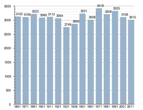 في سنة 1861 بلغ عدد السكان 3٬122 نسمة، وتطور العدد ليصل في سنة 2011 لـ 3٬015 نسمة.