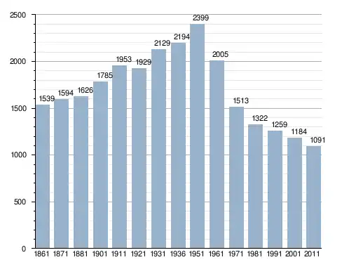 في سنة 1861 بلغ عدد السكان 1٬539 نسمة، وتطور العدد ليصل في سنة 2011 لـ 1٬091 نسمة.