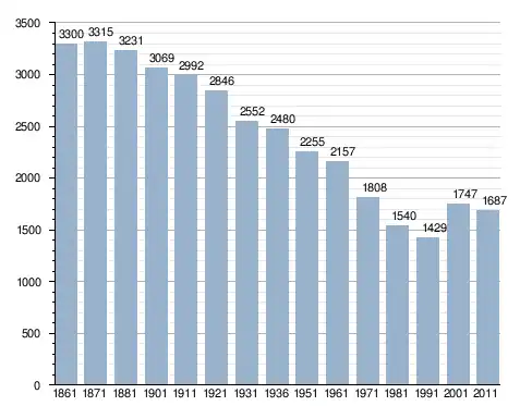 في سنة 1861 بلغ عدد السكان 3٬300 نسمة، وتطور العدد ليصل في سنة 2011 لـ 1٬687 نسمة.