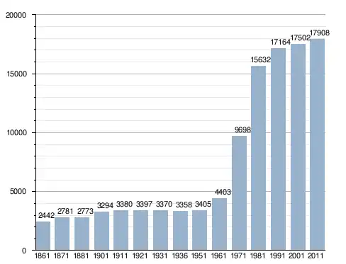 في سنة 1861 بلغ عدد السكان 2٬442 نسمة، وتطور العدد ليصل في سنة 2011 لـ 17٬908 نسمة.