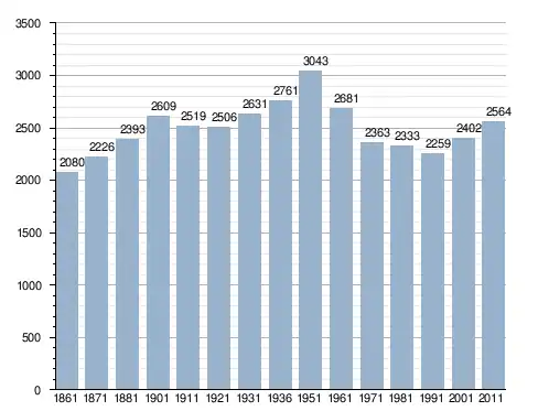 في سنة 1861 بلغ عدد السكان 2٬080 نسمة، وتطور العدد ليصل في سنة 2011 لـ 2٬564 نسمة.