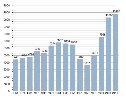 في سنة 1861 بلغ عدد السكان 4٬431 نسمة، وتطور العدد ليصل في سنة 2011 لـ 10٬820 نسمة.