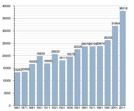 في سنة 1861 بلغ عدد السكان 13٬263 نسمة، وتطور العدد ليصل في سنة 2011 لـ 38٬018 نسمة.
