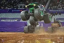 عرَضْ مونستر جام 2017، يَعرضُ شاحنة غرايف ديغر قافزةً في الهواء بينمَا المشجِّعُون يلتقطون الصُّوَر