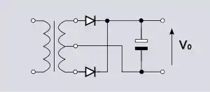 يمكن استخدام العلاقة التالية لحساب ارتفاع المويجة من القعر إلى القمة في حالة مقوم الموجة الكاملة: