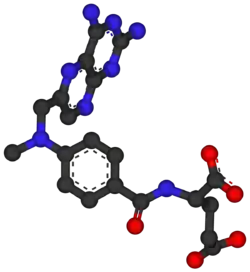 أظهر فريق من الباحثين بقيادة سيدني فاربر في عام 1947 أن الأمينوترين، وهو مادة كيميائية تماثلية لحمض الفوليك طورها ييلابراجادا سوبارو من ليديرل Yellapragada Subbarao of Lederle، يمكن أن تحفز شفاء الأطفال الذين يعانون من لوكيميا الأرومة اللمفاوية الحادة. لقد كان تطوير نظائر حمض الفوليك مدعومًا باكتشاف أن أيض حمض الفوليك قد ساهم في الإصابة بسرطان الدم، وأن النظام الغذائي الذي يعاني من نقص حمض الفوليك يمكن، على العكس، أن يحدث تحسنًا. ولم تكن آلية العمل وراء هذه التأثيرات مجهولة في ذلك الوقت.[9] كانت هناك نظائر أخرى لحمض الفوليك قيد التطوير، وبحلول عام 1950، تم اقتراح الميثوتريكسيت (المعروف آنذاك باسم أميتوترين) كعلاج لسرطان الدم.[10] أظهرت الدراسات التي أجريت على الحيوانات في عام 1956 أن المؤشر العلاجي للميثوتريكسيت كان أفضل من ذلك الخاص بالأمينوترين، وبالتالي تم التخلي عن الاستخدام السريري للأمينوترين لصالح الميثوتريكسيت.