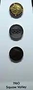 | 1960 | سكوو فالي، الولايات المتحدة | الوجه: رأسَي رجل وامراءة يحيطهما معلومات عن الدورة. الخلف: دوائر أولمبية كبيرة مع شعار الدورة: Citius, Altius, Fortius واسم اللعبة. |