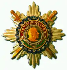 - منجمين أبيض مزخرف رباعي الزوايا، يقعان على الجانبين الأيمن والأيسر من السلسلة.وضعت في وسط الميدالية الدائرية زخرفة ملغومة حمراء.يوجد بائع مكتوب في وسط الميدالية بأحرف هيدر علييف.السيوف الفضية المتقاطعة تحت الرصيعة في سلسلة السيف.