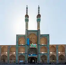 ▪ تكية أمير جقماق :- هذا البناء ايضاً هو ضمن هذه المجموعة ويتصف بكونه ذا منارتين قائمة على مدخل مستطيل وجزء من اعلى الباب مغطى بالقاشاني ويطل على سوق يزد القديم، وقد شُيّدَ أواخر القرن التاسع للهجرة وتزامناً مع بناء مسجد أمير جقماق، ولكن تصميمه بمنارتين وحجيرات صغيرة مكشوفة من الامام كل هذا يوحي إلى طراز القرن الثالث عشر للهجرة. ولهذه التكية خمس غرف وبتصميم مقوس من الجهتين، وقد استُخدِمَ في البناء الآجر المطلي والقاشاني، وزُيّنَ اسفل المنارة بالخط الكوفي ذي اللون الازرق الغامق، وفي وسطه حجر من المرمر الجميل وقد حفر عليه اسم مؤسسه وتاريخ تشييده وبخط النسخ، كما نلاحظ على اطراف الغرف آيات من القران الكريم نُقِشَت عليه أسماء الله الحسنى بالكاشي المعرق الجميل.[15]