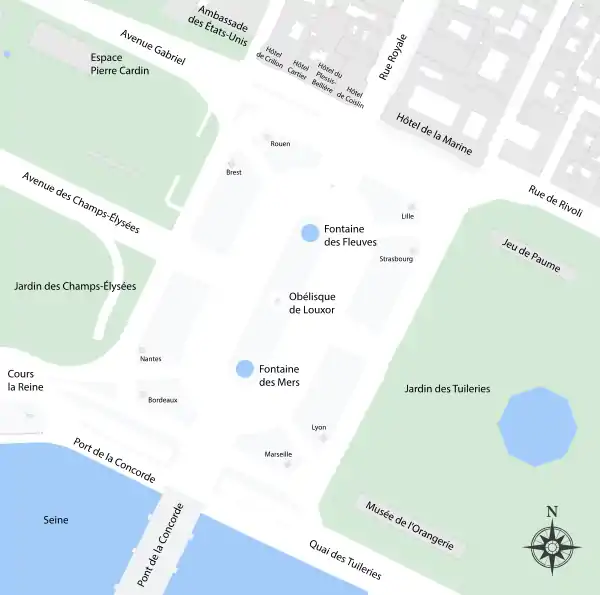- شمال الميدان: مبنيان حجريان متطابقان يفصل بينهما شارع رويال. يضم الجزء الشرقي وزارة البحرية، وفي الغرب فندق دي كريون. يؤدي شارع رويال إلى كنيسة مادلين. تقع سفارة الولايات المتحدة في زاوية الميدان عند تقاطع شارع غابرييل وشارع بواسي دانجلاس