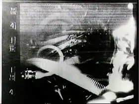 ![]() تصوير بواسطة كاميرا تلفزيون بطيئة المسح على متن فايث 7 (أعلى) لرائد الفضاء ليروي غوردون "غوردن" كوبر (أسفل) | |