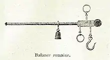 طوره الرومان قبل حوالي ألفي عام. ويستخدم هذا النوع من الموازين وزنًا صغيرًا لقياس أوزان أثقال كبيرة. وهناك ذراعان للقضيب الأفقي: ذراع قصيرة، وذراع طويلة. ويوضع الثقل في كفَّة الذِّراع القصيرة. يحدد وزن الشيء بتحريك ثقل الميزان على الذراع الطويل المقسم، حتى يحدث توازن ويكون الذراع أفقيا تماما، وتعطي قراءة تلك التقسيمات وزن الشيء (أو بمعنى ادق كتلته بالكيلوجرام مثلا).