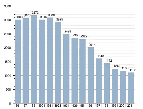 في سنة 1861 بلغ عدد السكان 3٬009 نسمة، وتطور العدد ليصل في سنة 2011 لـ 1٬108 نسمة.