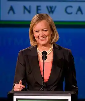 مارغريت كوشينغ "ميغ" ويتمان (14 أغسطس، 1956) هي سيدة أعمال وصاحبة منصب تنفيذي. وهي مديرة شركة هوليت-باكارد (HP)، ورئيسة مجلس إدارتها والمديرة التنفيذية.[10] ولدت ويتمان في لونغ آيلند بولاية نيويورك. تخرجت ويتمان في جامعة برنستون وكلية هارفارد للأعمال.[11] شغلت ويتمان منصبًا تنفيذيًا في شركة والت ديزني، حيث كانت نائب رئيس التخطيط الاستراتيجي طوال ثمانينيات القرن الماضي. وفي تسعينيات القرن الماضي، شغلت منصبًا تنفيذيًا آخر في شركات: دريم ووركس ستوديوز، شركة بروكتر وغامبل، وشركة هاسبرو. وإضافة إلى ذلك، ترأست ويتمان مجلس إدارة شركة إيباي، وكانت المدير التنفيذي في الوقت ذاته من عام 1998 وحتى 2008. وأثناء تلك الفترة، أشرفت ويتمان على توسيع نفوذ الشركة حيث حوت الشركة 15,000 ألف موظف وعائدات سنوية قُدرت ب 8 مليار دولار أمريكي عام 2008؛ مقارنة ب 30 موظف وعائدات سنوية 4 مليار دولار أمريكي عام 1998.[12] وفي عام 2014، أدرج اسم ويتمان في قائمة فوربس لأكثر السيدات تأثيرًا في العالم.[13] وفي 2008، ذكرت صحيفة النيويورك تايمز بأن ويتمان تبدو من بين النساء الأكثر توقعًا بتوليهم رئاسة الولايات المتحدة الأمريكية.[14] وفي فبراير 2009، خاضت ويتمان انتخابات حاكم ولاية كاليفورنيا، لتصبح ثالث امرأة تتولى هذا المنصب في 20 عامًا فقط. وفي يونيو 2010، فازت ويتمان بانتخابات الحزب الجمهوري. وفي العام ذاته، صارت ويتمان رابع أغنى سيدة في ولاية كاليفورنيا بثروة بلغت 1,3 مليار دولار أمريكي.[15][16] أنفقت ويتمان على حملتها الانتخابية أكثر من أي مرشح آخر؛ [17][18] إذ أنفقت 144 مليون دولار أمريكي من مجموع ثروتها، و178,5 مليون دولار أمريكي بما في ذلك الجهات الممولة.[19] لكن في 2 نوفمبر، خسرت ويتمان الانتخابات لصالح إدموند جيرالد براون (جيري براون).[20]