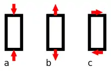 - الأحمال المحورية – تكون القوى المطبقة مرتبطة خطياً بالمحور الطولي للقضيب. تؤدي القوى إلى شد أو ضغط القضيب.[3]