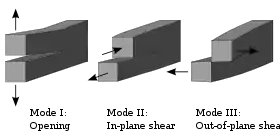 - انكسار الوضع الأول – وضع الفتح (إجهاد شد عمودي على مستوي الصدع)