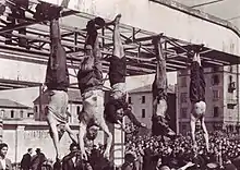 قاد بينيتو موسوليني مسيرة الزحف إلى روما بدءاً من ميلانو.[48] عانت المدينة أضراراً جسيمةً خلال الحرب العالمية الثانية بفعل قصف قوات الحلفاء المتواصل.[49] وعندما انسحبت إيطاليا من الحرب عام 1943، احتلت القوات الألمانية معظم أجزاء شمال إيطاليا حتى عام 1945. شُكّلت نتيجةً لذلك جماعات مقاومة مناهضة للفاشية اتبعت أسلوب حرب العصابات ضد القوات النازية والفاشية المُشترَكة.[16] تقدمت القوات الأمريكية صَوْب ميلانو عندما أصبحت الحرب على وشك النهاية كجزءٍ من حملة ربيع عام 1945 في إيطاليا، لكن عناصر المقاومة تمكنت من السيطرة على المدينة قبل وصولهم وأعدمت موسوليني بالإضافة إلى العديد من أعضاء حكومته. عُلّقت جثث موسوليني وعشيقته كلارا بيتاتشي وقادة فاشيين آخرين في ساحة عامة في ميلانو في التاسع والعشرين من أبريل 1945، في نفس المكان الذي كان قد أُعدم فيه 15 معارضاً في العام الذي سبقه.