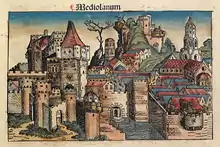 استقر السلت في ميلانو والمنطقة المُحيطة بها عام 400 قبل الميلاد تقريباً.[26] وفي عام 222 قبل الميلاد غزا الرومان المنطقة وخلعوا عليها اسم ميديولانوم. وبعد عدة قرون من السيطرة الرومانية أُعلنت ميلانو عاصمةً للإمبراطورية الرومانية الغربية في عهد الإمبراطور ديوكلتيانوس عام 286 بعد الميلاد. اختار ديوكلتيانوس البقاء في الإمبراطورية الرومانية الشرقية (عاصمتها نيقوميديا)، أما شريكه مكسيميانوس فقد أخذ مقاليد حكم الشطر الغربي. اهتم مكسميانوس بمدينته الجديدة وشرع يبني على الفور العديد من المعالم الضخمة التي ميّزتها.