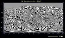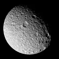 صورة للقمر مايمس التقطتها مركبة كاسيني، ويظهر شكله بيضويا بوضوح.