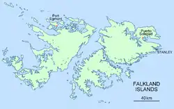 موقع ميناء إغمونت في جزر فوكلاند باللون البرتقالي (يظهر إلى أعلى يسار الصُّورة).