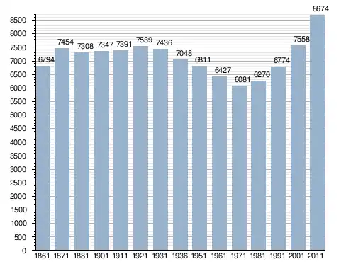في سنة 1861 بلغ عدد السكان 6٬794 نسمة، وتطور العدد ليصل في سنة 2011 لـ 8٬674 نسمة.
