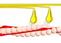 في الشكل أعلاه رؤوس الميوسين (أصفر) وفتيلات الأكتين (برتقالي وأحمر).