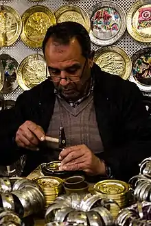 يتم تعليقها كزينة على الجدران، وكذلك الأواني النّحاسية المستخدمة في الطّبخ، وأبرز ما تشتهر به هذه الصّناعة هو النّقش بخيوط الفضة على النّحاس الأصفر لتبدو تحفة فنية يتهافت الزّوار على شرائها واقتنائها.
