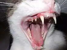 أسنان الناب (Canine tooth) الأربعة، في القطط المحلية. (أكبر أسنان من الصفوف العلوية والسفلية للأسنان.)