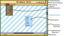 النوافذ كائنات ثنائية الأبعاد تسبح فوق واجهة تُعرف باسم سطح المكتب. في نظام النوافذ الحديث كامل المواصفات يستطيع المستخدم تغيير حجمها ونقلها وإخفاءها واستعادتها وإغلاقها. وعادةً ما تحوي النافذة كائنات رسوميّة أخرى مثل شريط القوائم والأدوات، والتحكّم، والرموز، ومنطقة العمل. في منطقة العمل تُعرَض المستندات أو الصور أو محتويات الملّجد المُختار ومحتويات أخرى. بقرب منطقة العمل، وداخل إطار النافذة، هناك منطقة مُشابهة للنوافذ تُسمى باللوحات؛ هذه اللوحات تعرض تفاصيل المجلّد أو المستند المُحدّد وتظهر معلوماته أو الخيارات ذات الصلة.