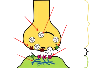 يتم تخزين الناقلات العصبية في المشبك في الحويصلات التشابكية، حيث تتجمع تحت الغشاء الخلوي في النهاية المحورية التي تقع في الجانب قبل المشبكي في المشبك. يتم إطلاق النواقل العصبية إلى الخارج وتنتشر عبر الشق التشابكي، حيث ترتبط بمستقبلات خاصة في الغشاء في الجانب بعد المشبكي في المشبك.[1]