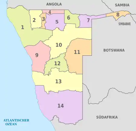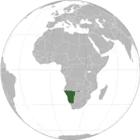 ناميبيا[16] أو رسميا جمهورية ناميبيا هي دولة تقع في جنوب غرب قارة أفريقيا، ويحدها من الغرب المحيط الأطلسي. وتشترك في الحدود البرية مع أنغولا وزامبيا من الشمال، و بوتسوانا من الشرق و جنوب أفريقيا من جهة الجنوب والشرق. على الرغم من أنه لا حدود لها مع زيمبابوي ، أقل من 200 متر من مجرى النهر ( خاصةً حدود زامبيا / بوتسوانا ) تفصل بينهما في نقاط الأقرب لهم. حصلت على استقلالها من جنوب أفريقيا يوم 21 مارس عام 1990، في أعقاب حرب الاستقلال في ناميبيا. عاصمتها وأكبر مدينة ويندهوك. ناميبيا هي دولة عضو في الأمم المتحدة ،وعضو في مجموعة التنمية لأفريقيا الجنوبية ،وعضو في الاتحاد الأفريقي ،وعضو في اتحاد الكومنولث.