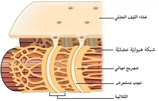 ![]() عضلةٌ هيكلية، يظهرُ فيها نبيبٌ مُستعرضٌ مُكبرًا. | |